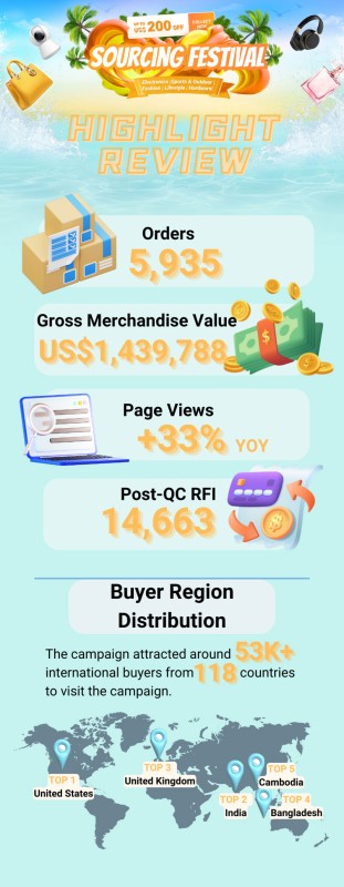 From 8,July to 9 August, the 33-day 2024 Global Sources Sourcing Festival has successfully concluded, showcasing a remarkable Gross Merchandise Value of US$1,459,788 and receiving 14,663post-QC RFIs from global buyers, which has greatly benefited our valued suppliers.